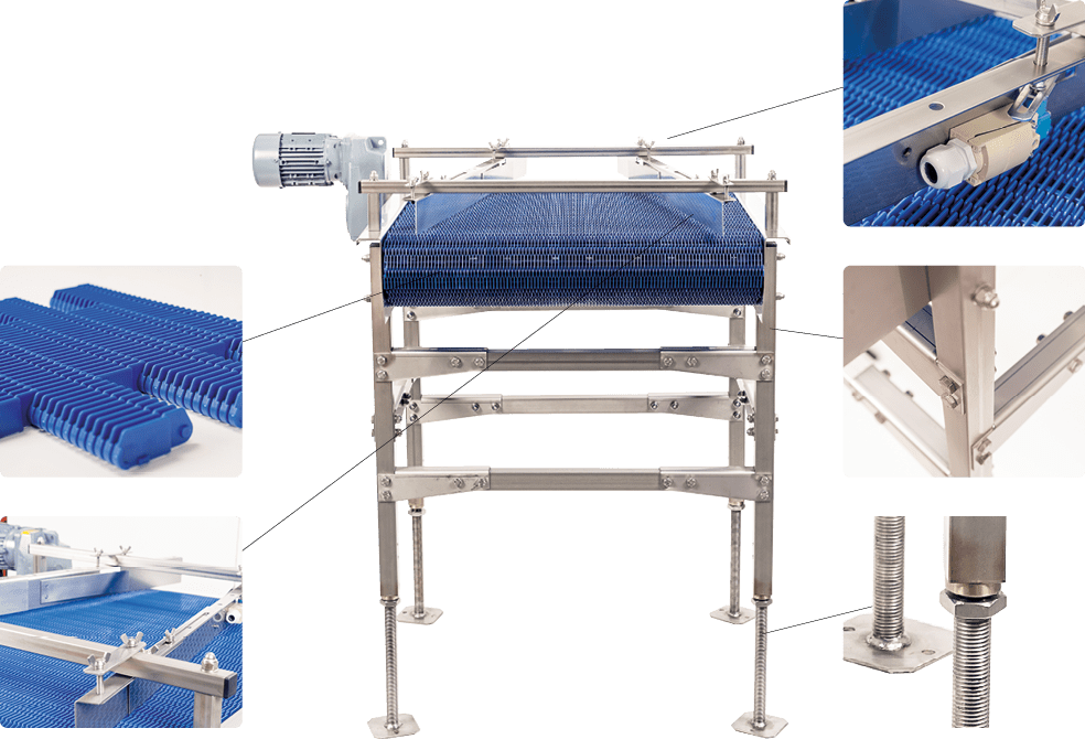 - drive by the proven flat gear motors of the LUBING conveyor systems (0.37 kW, special voltages on request)